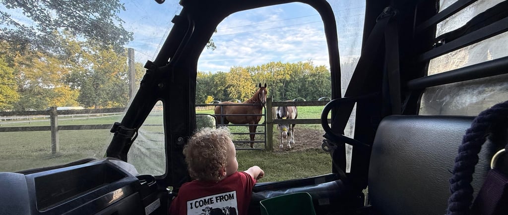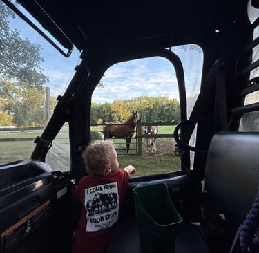 At just 2 years old, Kai feeds, leads, and waters the horses. He loves helping mom in the morning and on good days he is out there riding his horse. He loves tractors, lawnmowers, and of course the MULE.....he can almost drive it by himself. Give him another year and he will be able to handle almost anything out here.